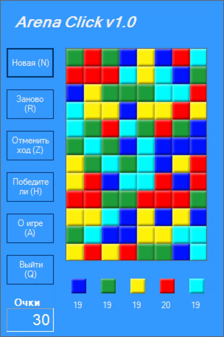 Arena Click - это небольшая игра, в которой Вам необходимо очистить поле. Удалять можно только связки квадратиков по два и более. Игра закончится тогда когда все поле будет очищено. Чем больше и быстрее Вы очистите поле, тем выше Ваше имя будет в таблице рекордов. Игра по виду простая, но очень увлекательная и интересная.