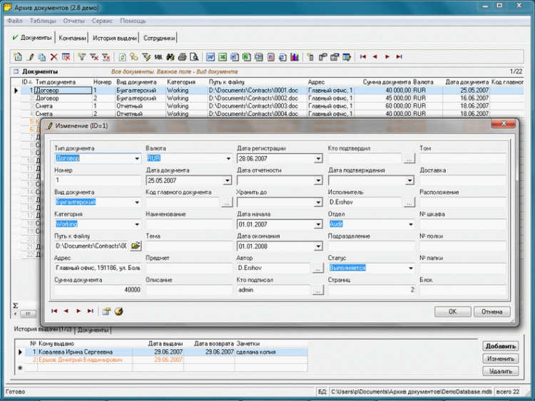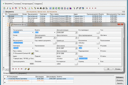Программа позволяет систематизировать учет и хранение документов, обеспечивает контроль исполнения документов на всех стадиях по срокам и ответственным, отслеживать движение документов, кто что когда взял, вернул. По каждому документу можно фиксировать произвольную дополнительную информацию, удобный поиск и продвинутый анализ, гибкая настройка прав доступа, сетевой и многопользовательский режимы, отслеживание истории изменений и многие другие удобства. Удобная сортировка и фильтрация по любому полю, экспорт напрямую в Excel, генерация документов Word на основе шаблонов (договоров, счетов), сетевой и многопользовательский режимы, ведение истории изменений. Вы можете создавать новые таблицы в базе данных, добавлять новые поля к ним (как хранимые, так и вычисляемые, в том числе по формулам типа SELECT…), хранить в базе данных картинки, определять ниспадающие списки и значения в них, привязывать подчиненные таблицы, считать итоги по формулам, строить дерево по заданным полям и другие удобства.