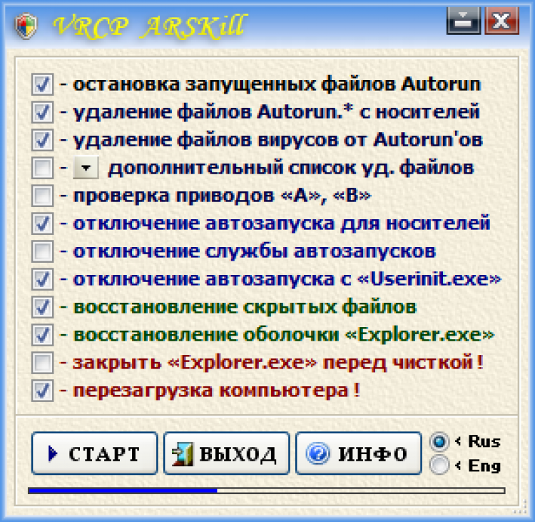 ARSKill - утилита поможет избавиться от надоедливых Autorun'ов (с помощью которых запускаются вирусы и другие вредоносные программы), находящихся на различных съёмных носителях информации, запущенных в памяти компьютера, а также предотвратить их появление в системе в будущем. Также поможет почистить систему от некоторых уже имеющихся в ней вредоносных программ и другого мусора.