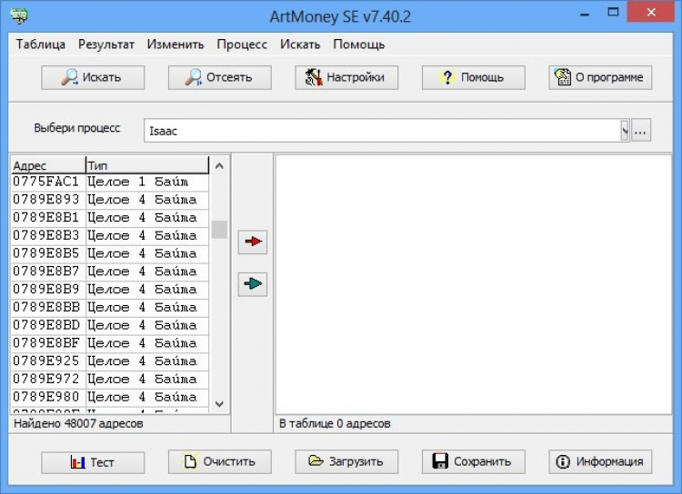 После старта ArtMoney SE предлагается запустить нужную игру, в которой предстоит изменить параметры. На первом этапе программа сканирует память и файлы игры на предмет заданных значений показателей игрока. На втором этапе происходит отсев ненужных значений. В результате этих действий остаются адреса с переменными, которые необходимо изменить.