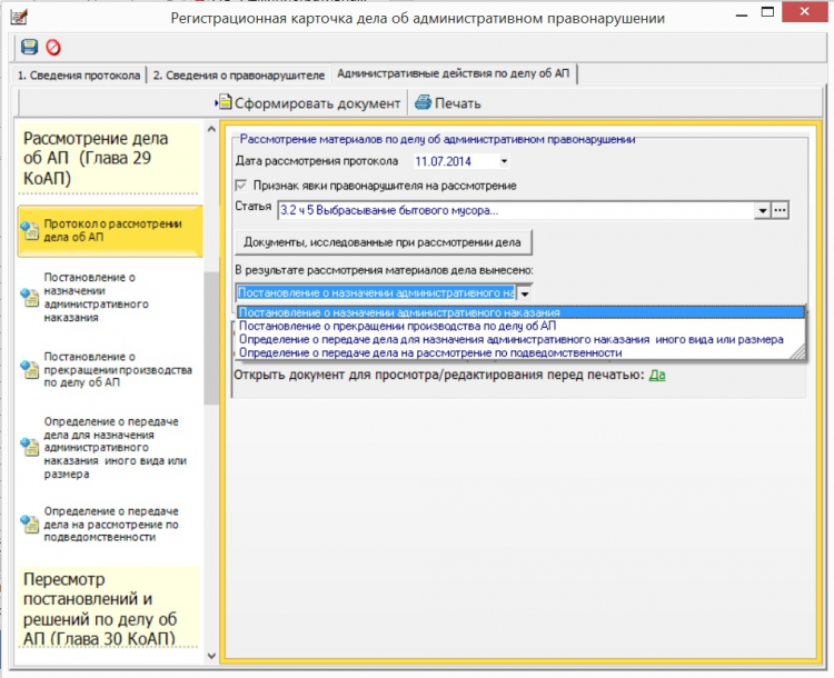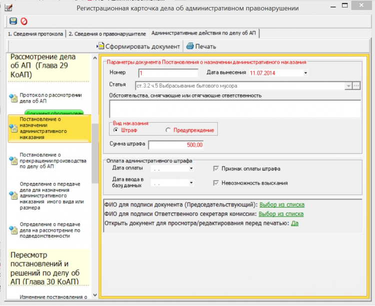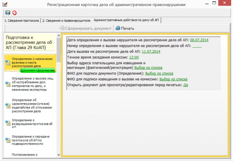 - Печать необходимых документов дела: реестра зарегистрированных дел об административных правонарушениях реестра извещений о вызове нарушителя, определения и извещения о вызове нарушителя на рассмотрение материалов по делу, протокола рассмотрения дела, постановления, извещения и квитанции на уплату административного штрафа, сопроводительного письма для передачи в органы ФССП для принудительного взыскания административного штрафа.