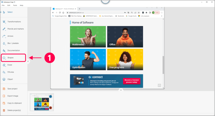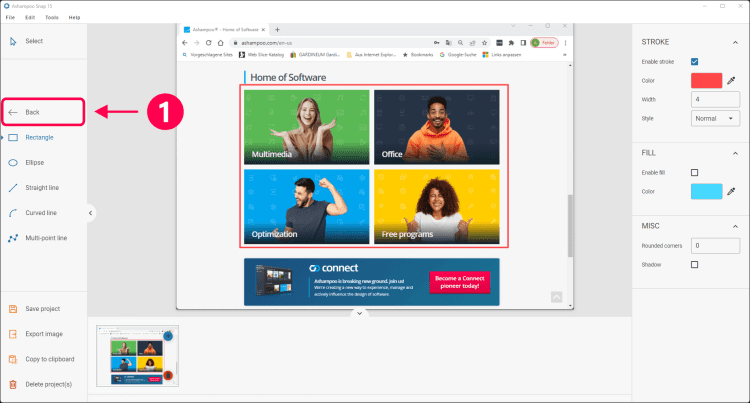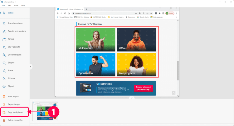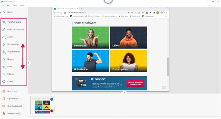 После создания скриншота, Ashampoo Snap позволяет отредактировать его, наложив ряд эффектов, изменив размер, добавив текст, использовав заливку и множество других инструментов. При помощи Ashampoo Snap можно отправлять полученные изображения на печать, по электронной почте или загружать на Facebook, а полученные видео - на аккаунт Youtube.