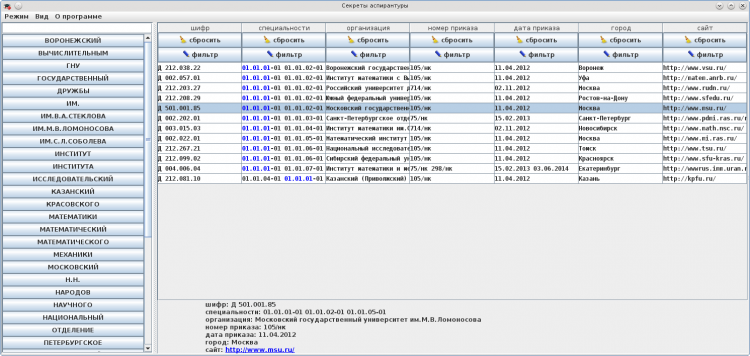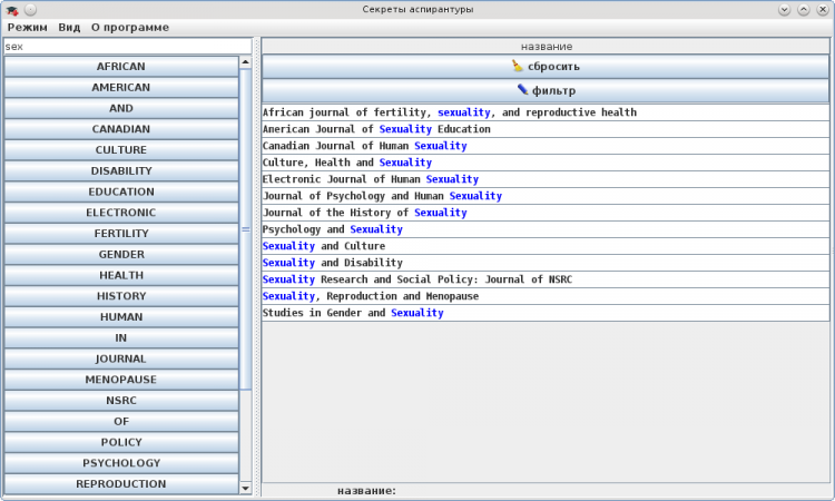 AsperhelpList - это программа предназначена для удобного и быстрого поиска журналов по ключевым словам в его названии, диссертационного совета по городу и номеру специальности. Программа может быть полезна молодым ученым и аспирантам, которые еще не интегрировались с мировой и отечественной научной системой и не знают, какие журналы или диссертационные советы существуют по их специальности.