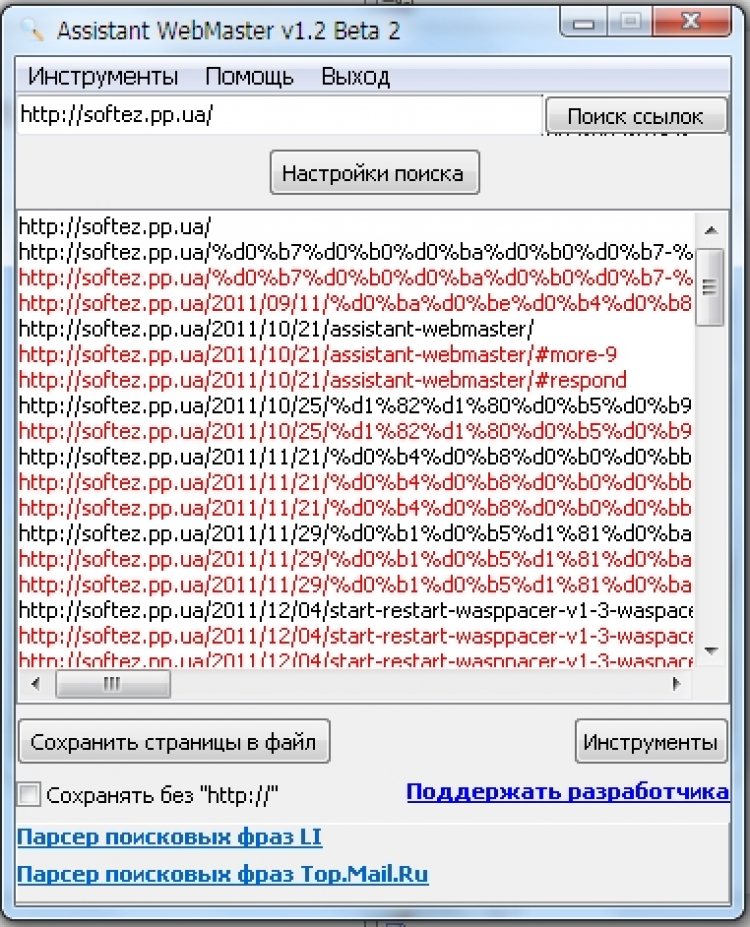 - поиск ссылок (внешних и внутренних) на вашем сайте, с возможностью сохранения их в .txt-файл;