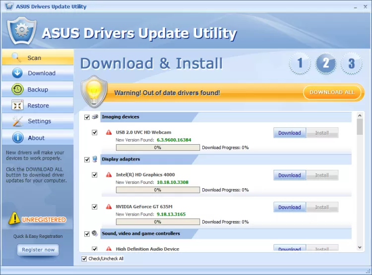 ASUS Drivers Update Utility сканирует все установленные в системе драйвера и проверяет наличие доступных обновлений для них. После сканирования вы можете посмотреть список драйверов, которые можно обновить, а также скачать и установить новые версии прямо из окна программы. Кроме этого, ASUS Drivers Update Utility может делать бэкапы установленных драйверов и восстанавливать их в случае возникновения каких-либо проблем.