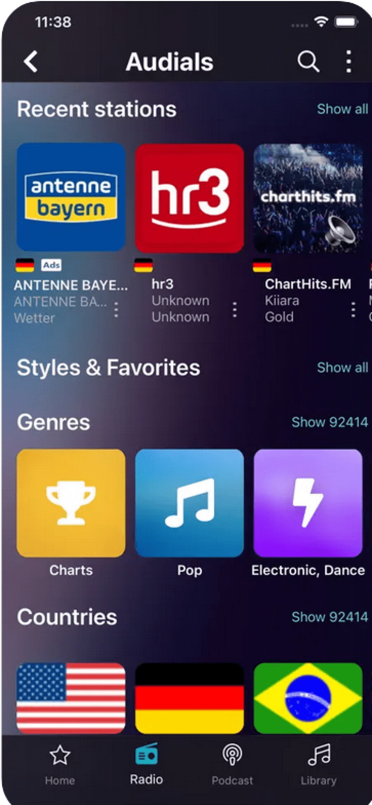 Audials Radio & Podcast — это интернет-радио, которое позволяет наслаждаться звучанием свыше чем 63000 радиостанций. Внушительный функционал вкупе с возможностью синхронизации с ПК придется по душе меломанам.