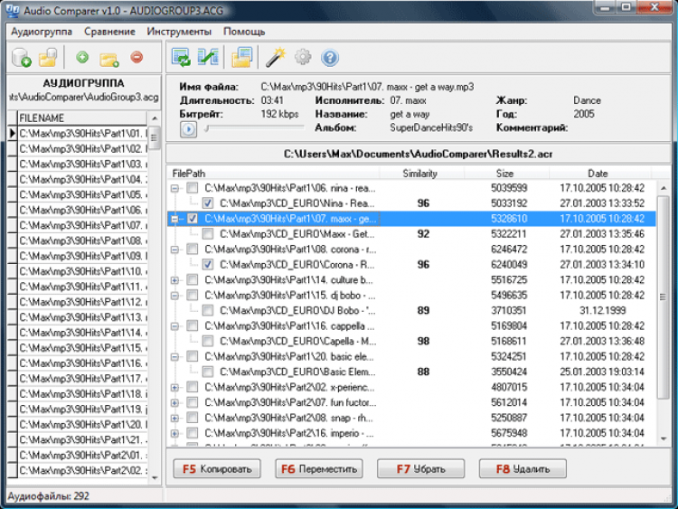 При этом программа никогда не забывает услышанную однажды мелодию. Именно поэтому наша программа умеет находить дубликаты, даже если они сжаты разными алгоритмами и с различным битрейтом. Audio Comparer умеет находить похожие файлы, в то время как конкуренты, не умеющие анализировать аудио-файлы по их звучанию, могут находить только полные файловые дубликаты.