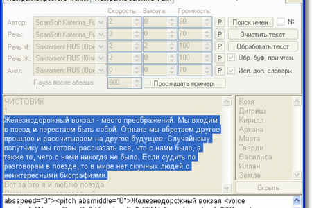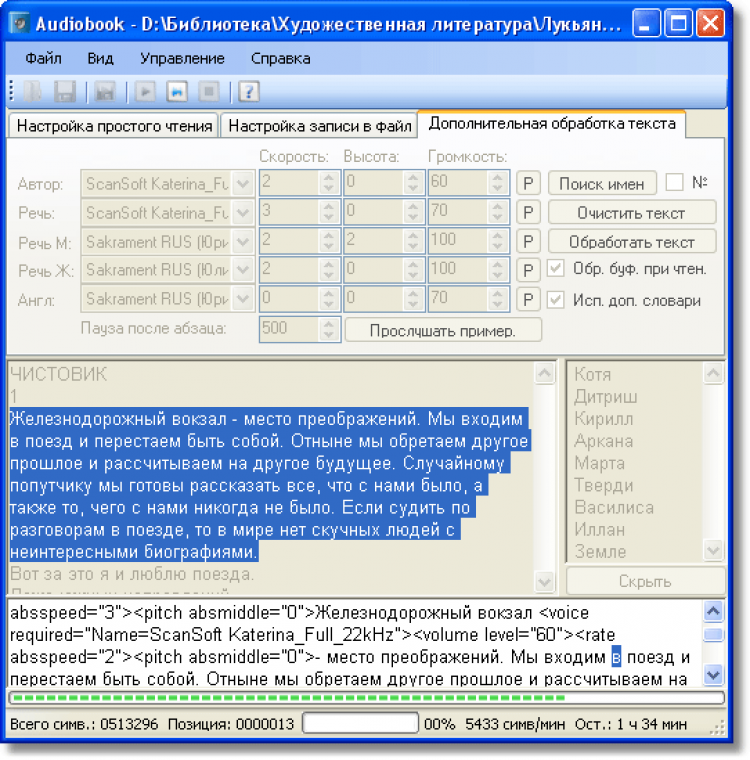 AudioBook - это программа, которая позволяет создавать аудио книги из просто текста. В ней используется TTS Engine стандартов SAPI 4 и SAPI 5, она позволяет создавать аудио книги в формате MP3, OGG, WMA, WAV, VOX, AU или AIFF. AudioBook использует особый анализатор диалогов, она заранее выполняет разметку текста перед созданием и "чтением" аудио книги. В программе используются уникальные словари, в основе работы которых, лежат регулярные выражения для каждого голоса. AudioBook может записывать речь с максимальной скоростью, самостоятельно делить книгу части во время записи и устранять ошибки произношения.