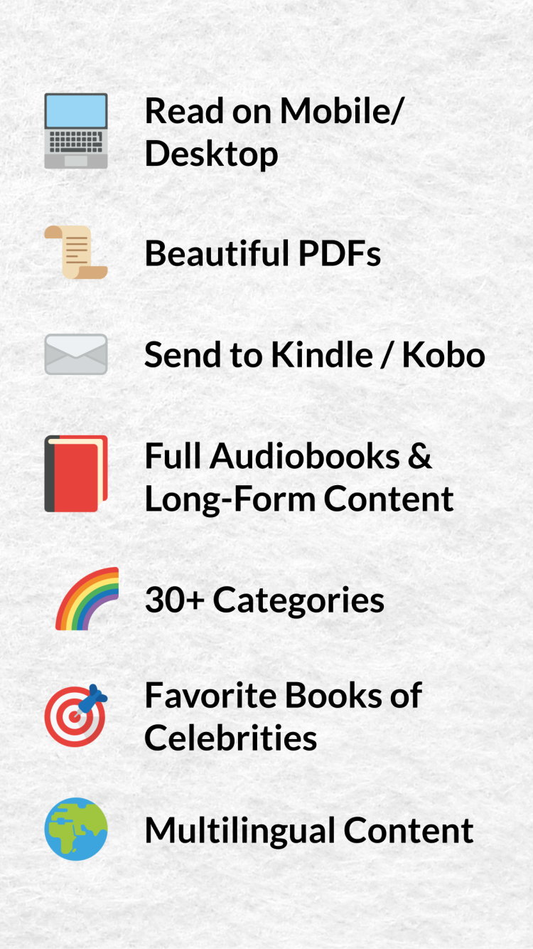 Что немаловажно, StoryShots подойдет и тем, кто лучше воспринимает визуальную информацию. Помимо аннотаций книг, программа предлагает вам инфографику, а также разнообразный анимированный и видеоконтент, чтобы сделать обучение более простым и удобным. А приятным дополнением станет возможность экспорта контента в формат PDF и интеграция с Kindle и Kobo. Это поможет вам наслаждаться чтением в любое время и в любом месте, не только на смартфоне, но и на ПК или на читалках электронных книг.