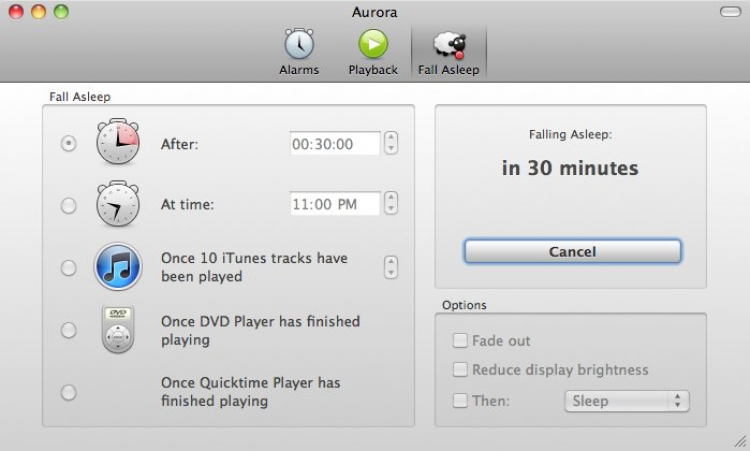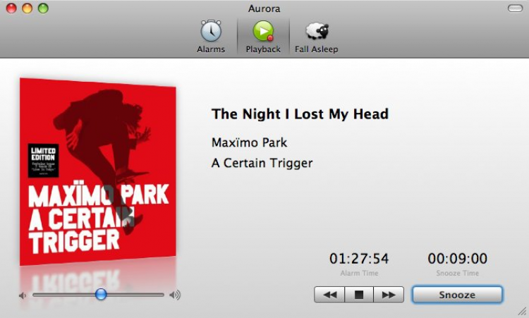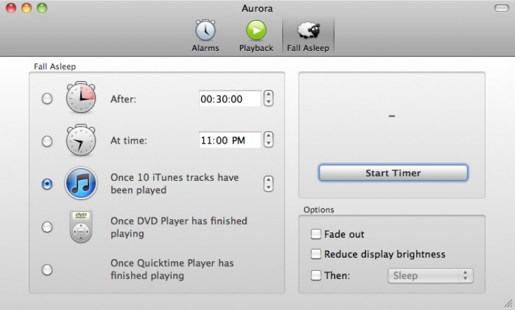 Aurora Будильник, благодаря которому пользователи могут просыпаться под любимые композиции из медиатеки iTunes. Помимо самого будильника в программе есть Snooze Timer и Fall Asleep Timer. Поддерживается управление с помощью Apple Remote. Aurora может "разбудить" Мак, даже если он был выключен. Помимо песен из плейлиста, пользователи могут выбирать различные радио-канали и ТВ-передачи, под которые они будут просыпаться каждое утро.