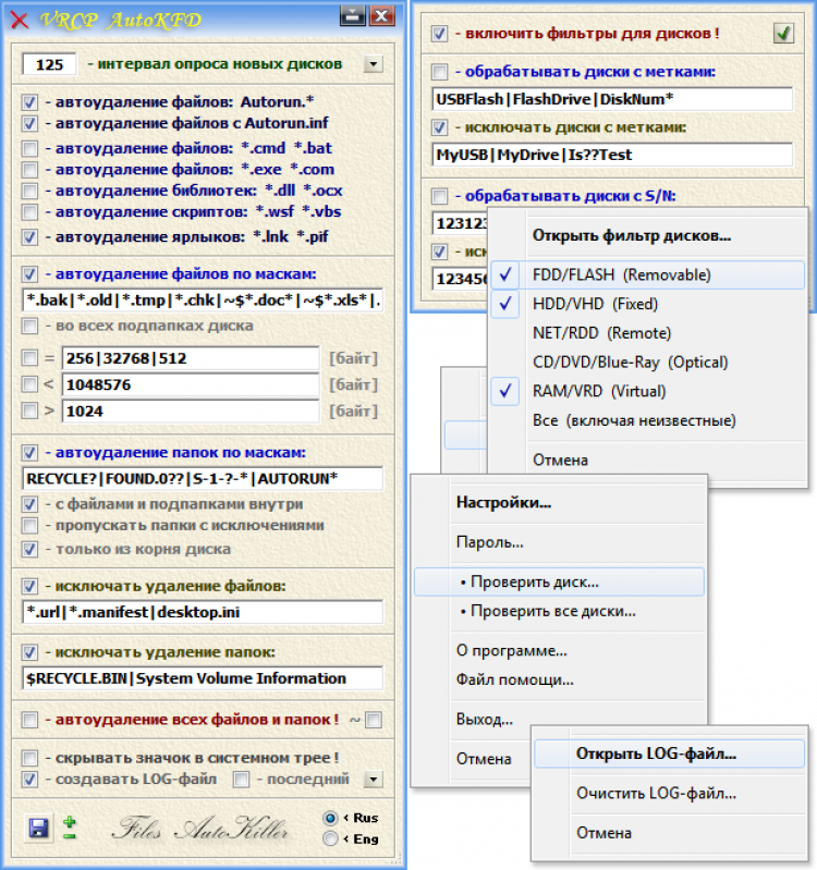 AutoKFD - это утилита предназначена для автоматического удаления ненужных файлов (мусора, временных файлов, вирусов и других вредоносных программ)с подключаемых к компьютеру съёмных носителей информации (флэш-дисков, съёмных жёстких дисков и т.п.).