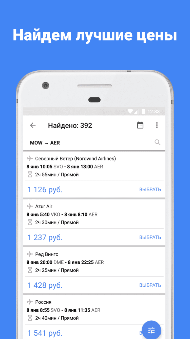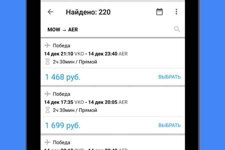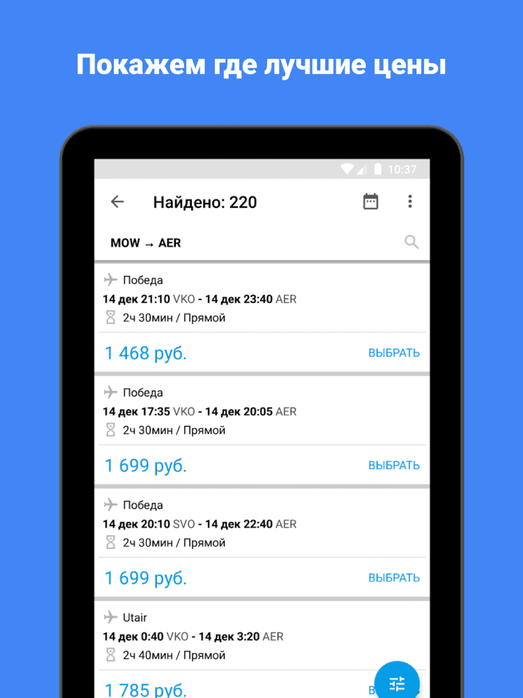 Авиабилеты Удобный поисковик авиабилетов по всем авиакомпаниям, системам бронирования и агентствам. Программа не продает авиабилеты, а находит где их можно купить по самым выгодным ценам. После нажатия кнопки "купить" происходит перенаправление на сайт агентства или авиакомпании где были найдены билеты. Показанные цены на авиабилеты включают в себя все сборы, никаких скрытых платежей. Информацию по бронированию, возврату и оплате билетов вы найдете на сайте агентства, через которое будете оформлять авиабилеты. Приложение полностью бесплатно и не содержит рекламы.
