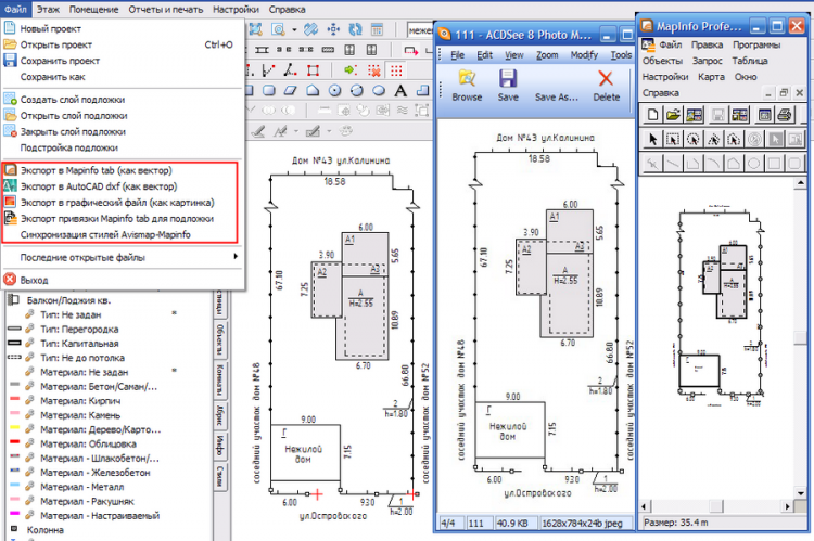 - Импорт проектов и планов, подготовленных в других чертежных программах (Автокад, Мапинфо, IN4/XML).