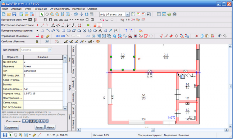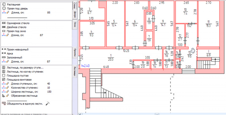 - Режимы построений: визуальное на плане или путем точных замеров.