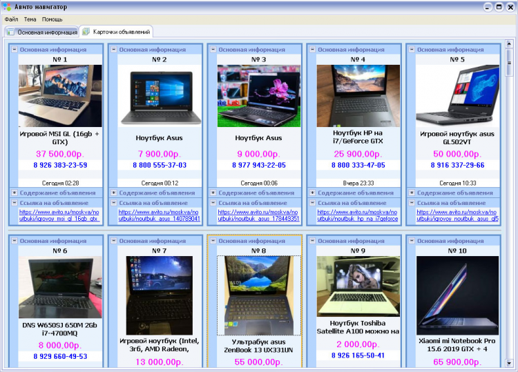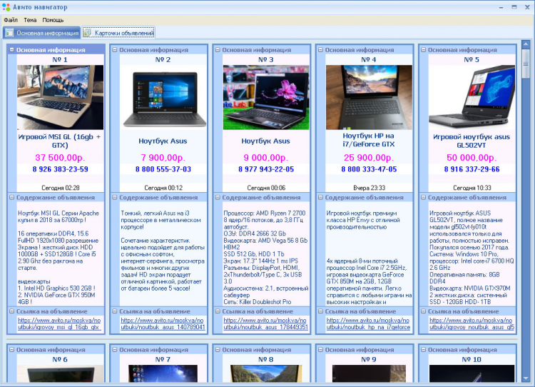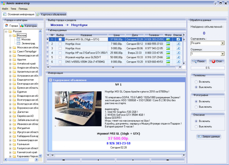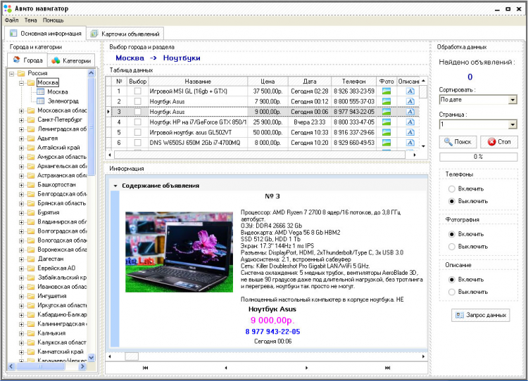 «Авито Навигатор» позволяет собрать данные выбранного региона(города) и выбранной категории объявлений, включая содержание объявления, номера телефонов абонентов подавших объявление, изображений объявления, а также дополнительную информацию.