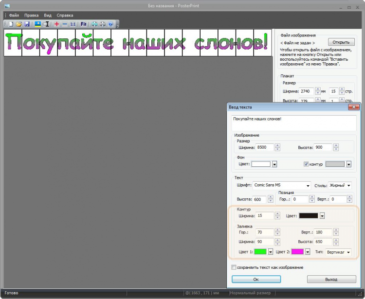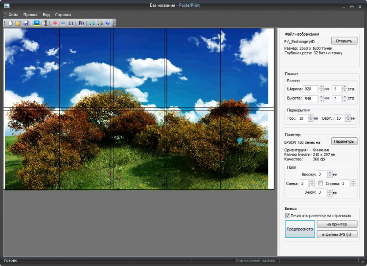 AVLSoft PosterPrint PosterPrint позволяет печатать плакаты большого размера, используя любой принтер установленный в системе. С помощью PosterPrint, Вы сможете без проблем распечатать плакат размером, например, два метра на три (вообще-то в программе нет ограничений на размер) на листах A4, используя Ваш принтер, конечно, напечатанные листы надо будет потом склеить между собой. В PosterPrint можно загрузить изображение (JPG, BMP, PNG, GIF) или набрать текст, используя какой-либо шрифт установленный в системе. Возможность регулировки размера и положения исходного изображения позволяет очень точно позиционировать его относительно границ листов.