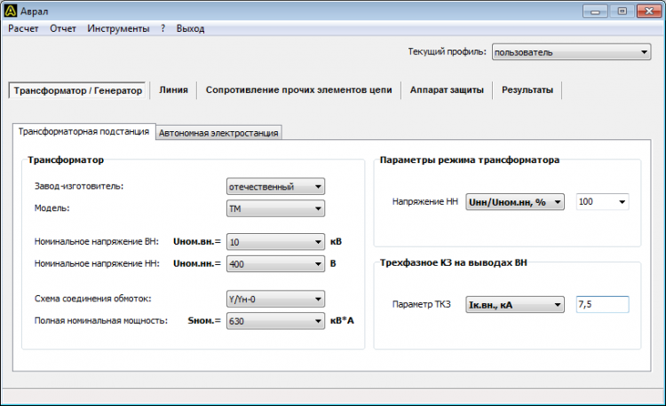 расчет токов 1-, 2- и 3-фазного короткого замыкания при питании потребителей от сети через понижающий трансформатор, или от автономной электростанции;