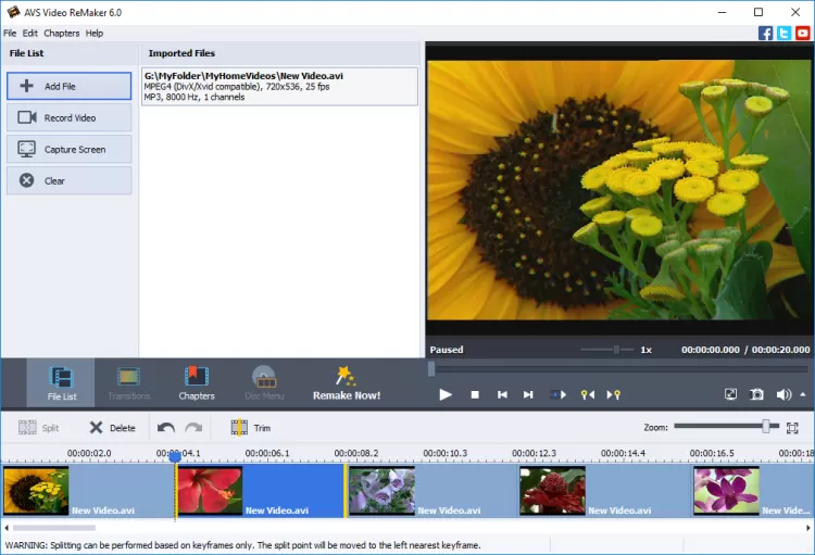 Предоставляет все необходимые функции для простого редактирования видео файлов. Она может редактировать видео в форматах AVI, VOB, MP4, DVD, Blu-ray, WMV, 3GP, FLV, TS, DVR-MS, MOV, MKV, H.263/H.264 и др.