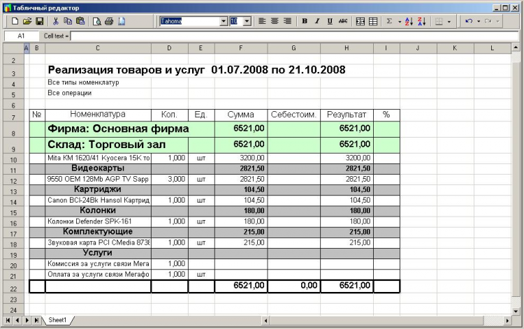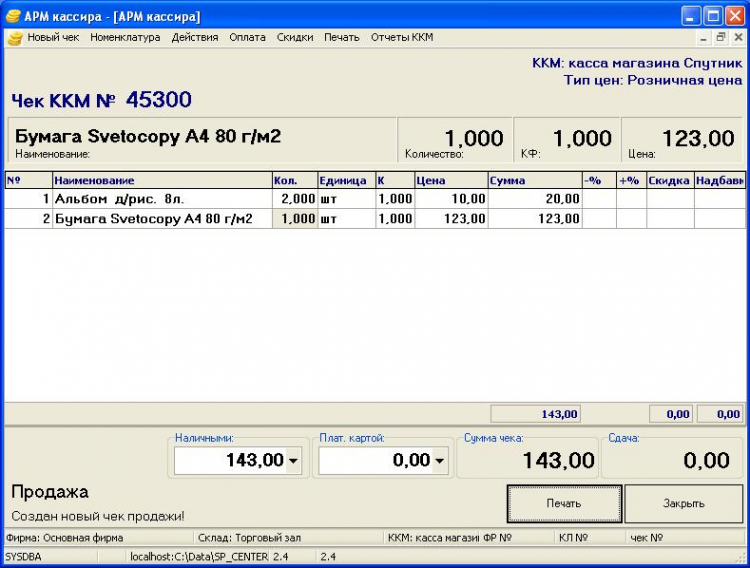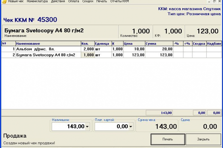 Автоматизация торговли Автоматизация деятельности малого предприятия с применением различного торгового оборудования, контрольно кассовой техники (в том числе ON-Line). Фиксация выполняемых операций в единой базе, анализ деятельности, гибкий настраиваемый интерфейс, позволяющий трансформировать основную программу в индивидуальное рабочее место, создавая на базе единого комплекса различные пользовательские интерфейсы. Например: Рабочее место менеджера (оператора, бухгалтера), рабочее место кассира, официанта (бармена), приемщика сервисного центра по ремонту электроники и др.