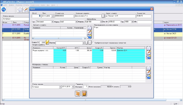 Автосервис - AllCarService - предназначена для учёта принятой в ремонт техники, запасных частей на складе и выполненных работ, а также выдачи необходимых документов: заказы-наряды, акты приема, акты выполненных работ, гарантийные талоны, копии чеков и отчёты по статусам. Она упрощает учёт и документооборот, что обеспечивает порядок в организации и высокую скорость обслуживания клиентов.
