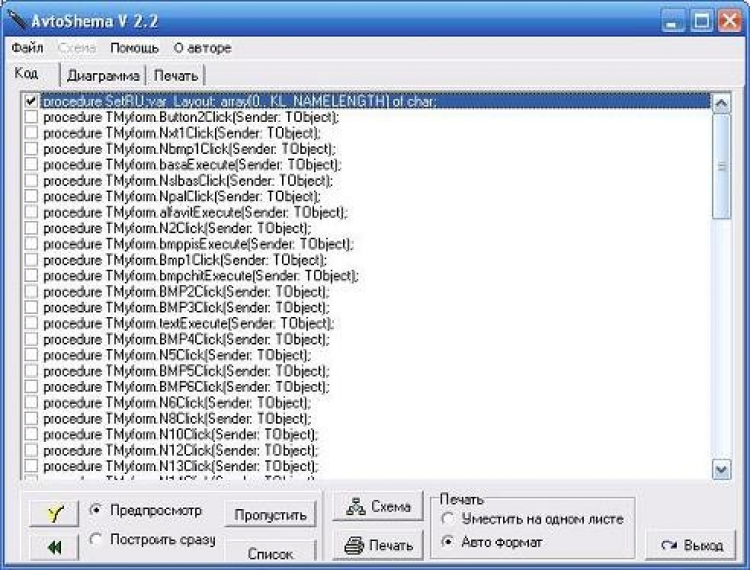 AvtoShema - это программа по автоматическому построению Блок-схем по готовому рабочему коду синтаксиса паскаль. Эта программа предназначена для построения Блок-схемы алгоритма по готовому коду. Загрузка кода как через модуль PAS так и через буфер обмена. Возможна загрузка из сохраненных файлов *.txt; Пригодится для лучшего понимания чужого кода. А также забытого своего для тех кто ленится комментировать.