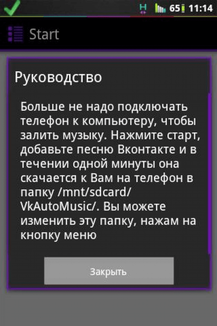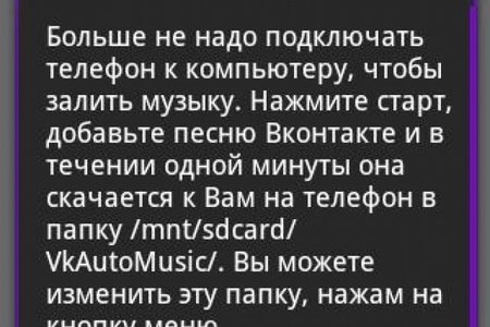 Автоскачка музыки Вконтакте Надоело каждый раз подключать телефон в компьютеру, чтобы закинуть музыку? Это приложение избавит Вас от этой суеты. Достаточно просто добавить аудиозапись в плейлист Вконтакте и в течение одной минуты она сама появится у Вас на телефоне в папке /mnt/sdcard/VkAutoMusic/. Вы можете изменить эту папку нажав кнопку меню. Приложение работает в фоновом режиме, так что вы можете спокойно заниматься своими делами, пока Ваша любимая музыка сама появляется у Вас на телефоне.