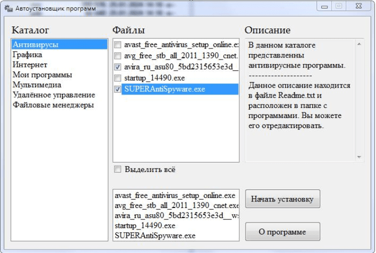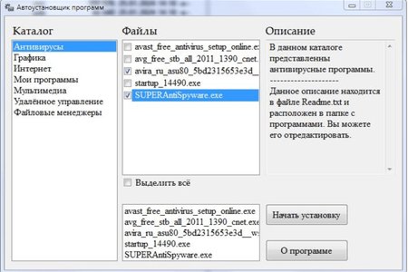При выборе необходимого каталога все его программы отобразятся в поле ФАЙЛЫ. Здесь можно выбрать необходимые файлы для установки, либо выбрать всё, щёлкнув галочку в поле «Выбрать всё». После чего активируется кнопка «Начать установку». В нижнем поле отображаются файлы программ, которые можно запустить отдельно двойным щелчком (ручной режим).