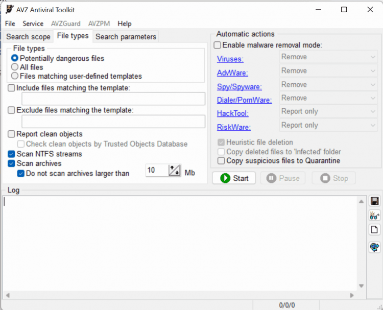 - Проверка архивов. Начиная с версии 3.60 AVZ поддерживает проверку архивов и составных файлов. На настоящий момент проверяются архивы формата ZIP, RAR, CAB, GZIP, TAR; письма электронной почты и MHT файлы; CHM архивы - Проверка и лечение потоков NTFS. Проверка NTFS потоков включена в AVZ начиная с версии 3.75 - Скрипты управления. Позволяют администратору написать скрипт, выполняющий на ПК пользователя набор заданных операций. Скрипты позволяют применять AVZ в корпоративной сети, включая его запуск в ходе загрузки системы;