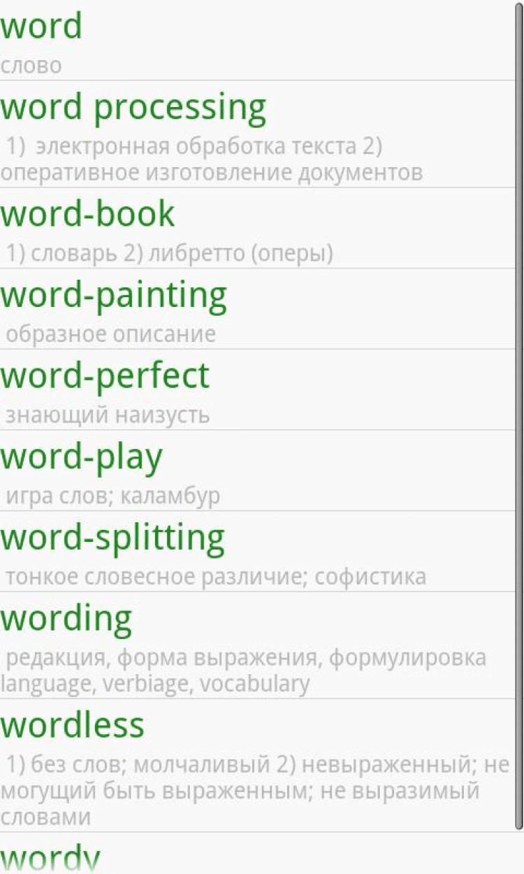 Ayv Англо-русский словарь — это простой и удобный в использовании англо-русский оффлайн словарь для мобильных телефонов и планшетов, под управлением Android. В базе данных программы содержится более 68000 слов.