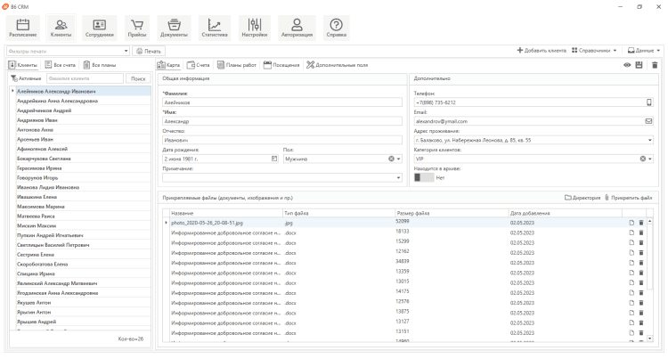 - Модуль "Управление клиентской базой" - центральный модуль системы, управляющий клиентской базой, счетами и планами работ. К карте клиента можно добавлять дополнительные реквизиты, прикреплять файлы и многое др.