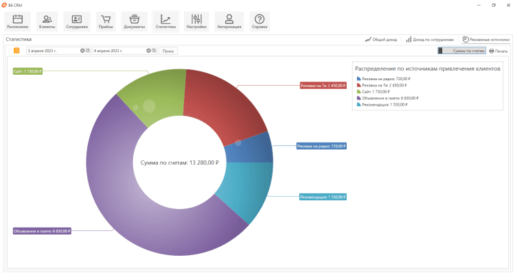 - Модуль "Статистика" для отчетов по общему доходу по продажам, распределению доходов по сотрудникам, по рекламным источникам.