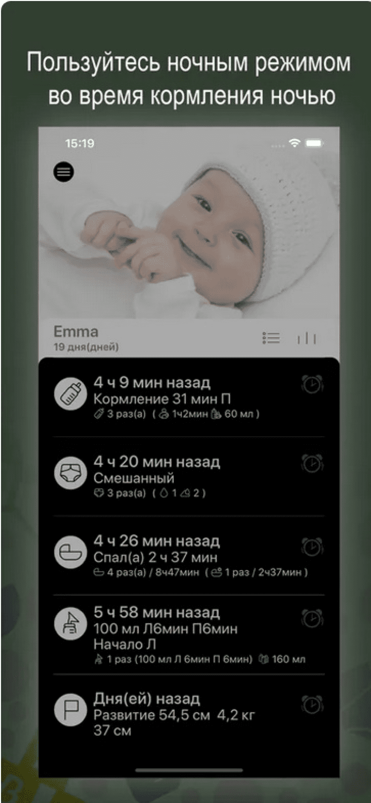 - сохранение информации о кормлении грудью, смесью или твёрдой пищей;