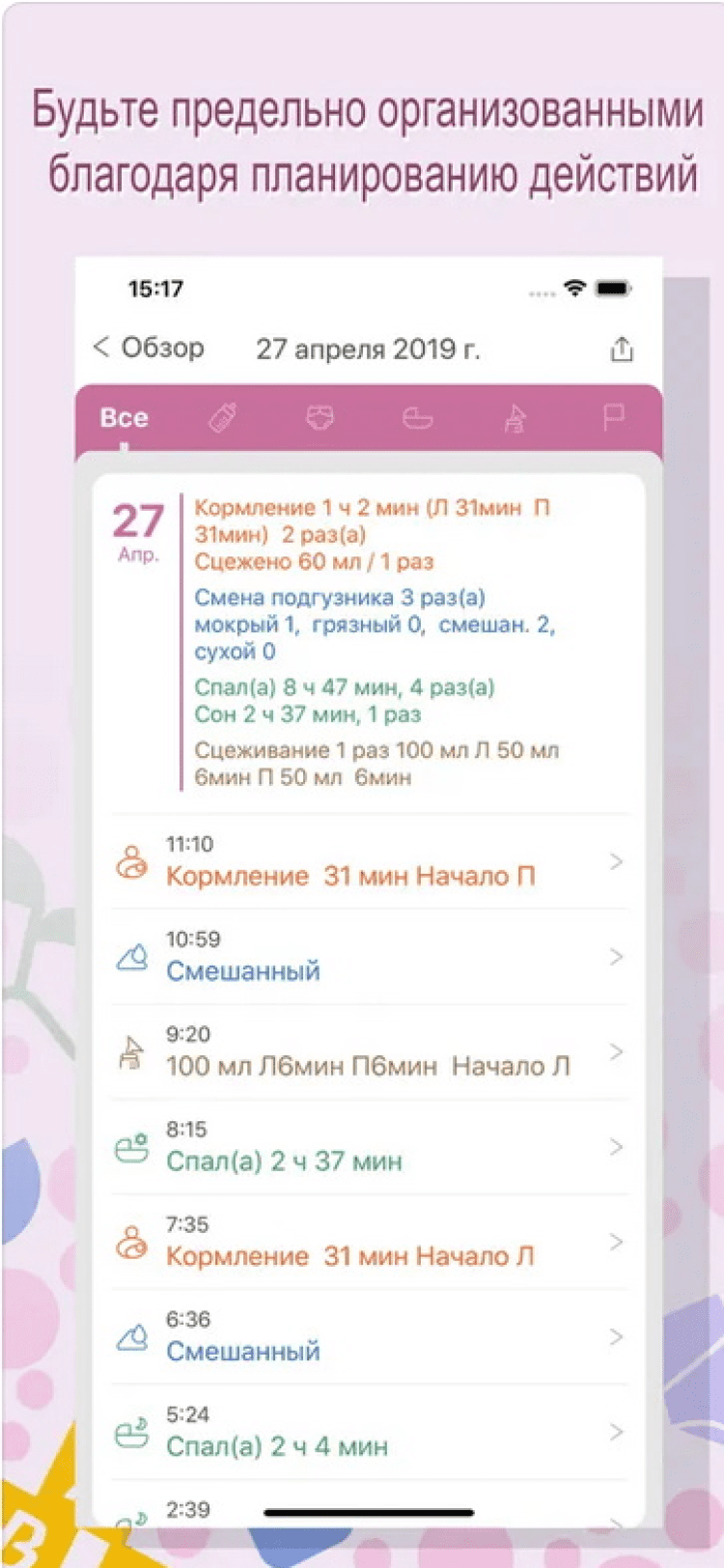 Мобильное приложение, в котором вы сможете с удобством записывать информацию о кормлении ребёнка, смене подгузника, режме сна, а также добавлять прочую информацию и фотографии. Кроме того, сохранённой информацией можно с лёгкостью поделиться с воспитателями, родными и врачами. Вся информация обрабатывается программой без участия пользователя, не отрывая родителя от процесса воспитания ребёнка.