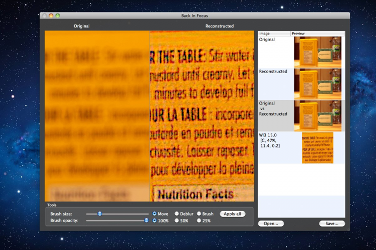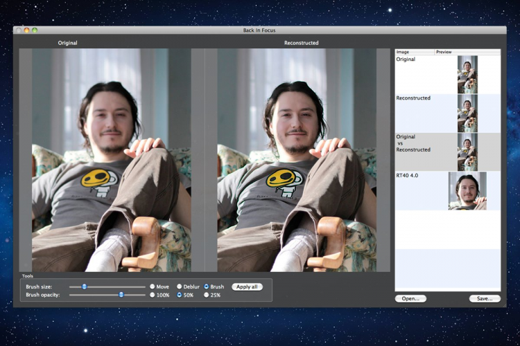 Back In Focus Поможет увеличить четкость размытой фотографии. С помощью Back In Focus можно легко и быстро задать правильный фокус на фотографии, избавивштсь от размытости.