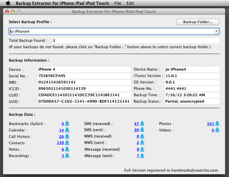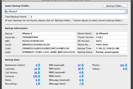 Backup Extractor Программа для извлечения файлов бэкапа для iOS из iTunes. С ее помощью можно восстанавливать закладки, записи в календаре, историю звонков, контакты, заметки, записи, SMS-сообщения фотографии и видео из резервных копий, которые хранятся в iTunes. Все эти данные могут быть экспортированы в формат CSV, HTML, iCalendar или VCard.