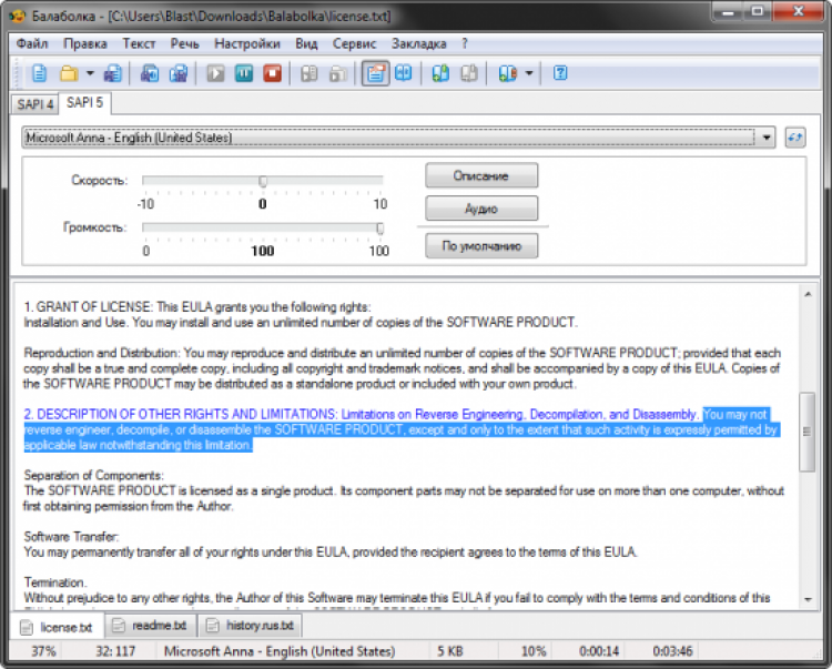 Это программа для чтения вслух текста, содержащегося в текстовом файле или буфере обмена Windows. Для чтения текста Balabolka может использовать любой речевой синтезатор, установленный в системе.