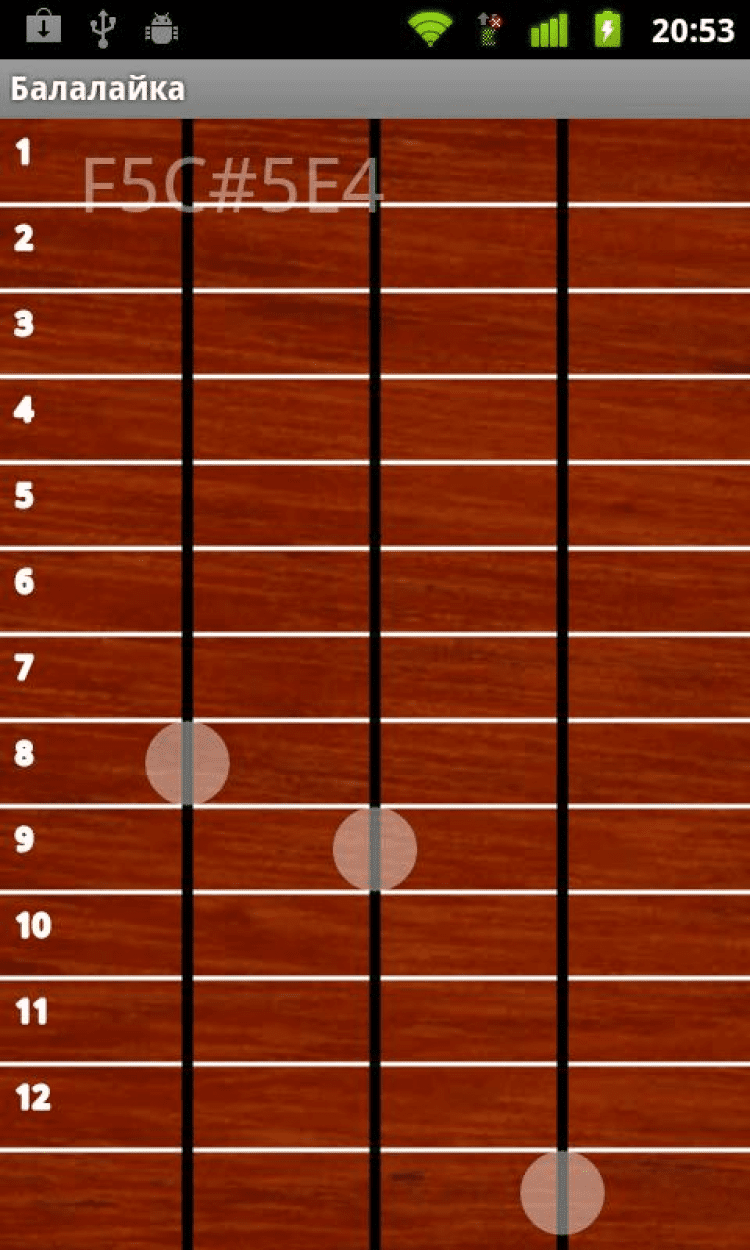 Балалайка Русский народный трёхструнный музыкальный инструмент на вашем андроиде. Прима балалайка. Русский народный трёхструнный музыкальный инструмент на экране вашего телефона или планшета. Используется традиционный академический строй две струны в унисон — нота «ми», одна — на кварту выше — нота «ля». Программа будет полезна как изучающим игру на этом инструменте, так и просто неравнодушным к русской народной музыке. Если вы знакомы с этим инструментом и нашли ошибку в расположение нот на грифе, просьба отписаться в комментариях.
