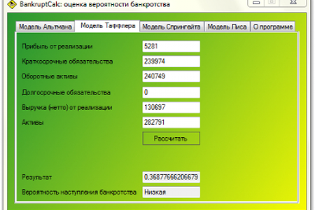 BankruptCalc - это программа для расчета прогноза вероятности наступления банкротства для предприятий четырьмя наиболее точными общепринятыми методами. Эта программа абсолютно бесплатна даже для коммерческого использования! И может пригодится для студентов ВУЗов, сотрудников банков и финансовых предприятий, а также бухгалтерам и экономистам различного уровня.