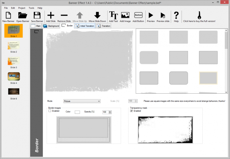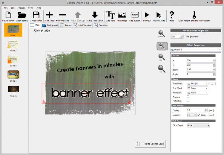 Banner Effect позволяет в считанные минуты создавать красивые анимированные баннеры для веб-сайтов. Баннер создается аналогично электронным презентациям, слайд за слайдом. На каждый слайд можно помещать текст и/или графику. Благодаря такому методу пользоваться программой довольно просто и удобно.