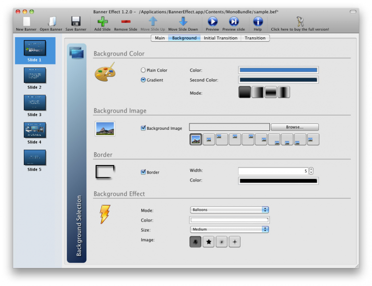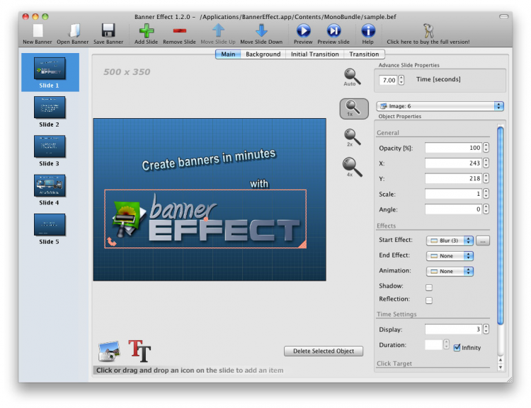 Banner Effect позволяет в считанные минуты создавать красивые анимированные баннеры для веб-сайтов. Баннер создается аналогично электронным презентациям, слайд за слайдом. На каждый слайд можно помещать текст и/или графику. Благодаря такому методу пользоваться программой довольно просто и удобно.