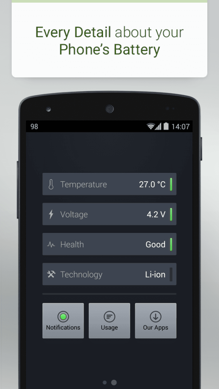 Батарея Небольшое приложение, которое будет отображать информацию о текущем уровне заряда аккумулятора вашего устройства в процентах. Эта программа отображает изменения в уровне заряда батареи с шагом в 1%, что делает ее максимально точной. Программа оптимизирована для всех размеров экрана и поддерживает все версии Android.