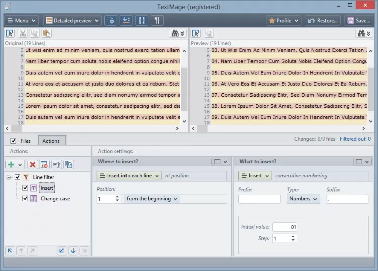 - Выполняйте различные операции: замена, вставка, удаление строк, вставка переносов или текстовых блоков, изменение кодировки;