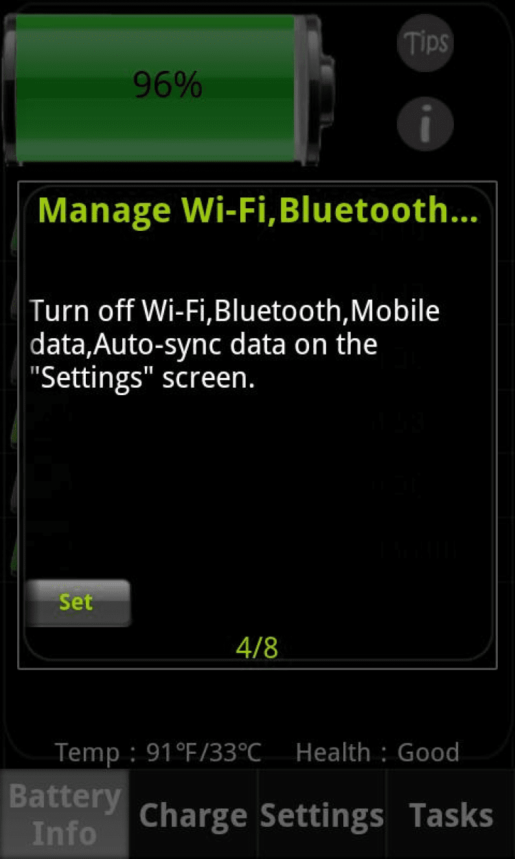 Battery Dr saver+a task killer Приложение, которое продлевает срок службы аккумулятора на 5-20%. Так же с его помощью, ваше мобильное устройство будет работать быстрее. В случае необходимости, программа поможет Вам быстро убить задачи и легко перезагрузить устройство. Вы сможете увидеть заряд аккумулятора, его температуру, время в режиме разговора, в режиме прослушивания аудио, просмотра видео, вебсерфинга и время в режиме ожидания.