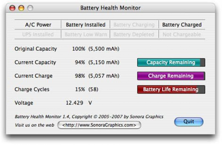 Battery Health Monitor Бесплатная утилита для пользователей ноутбуков Apple, которая мониторит показания аккумулятора и выводит их в удобом и понятном виде. Battery Health Monitor показывает показывает изначальную и текущую емкость аккумулятора, текущий заряд, вольтаж и другую полезную информацию.