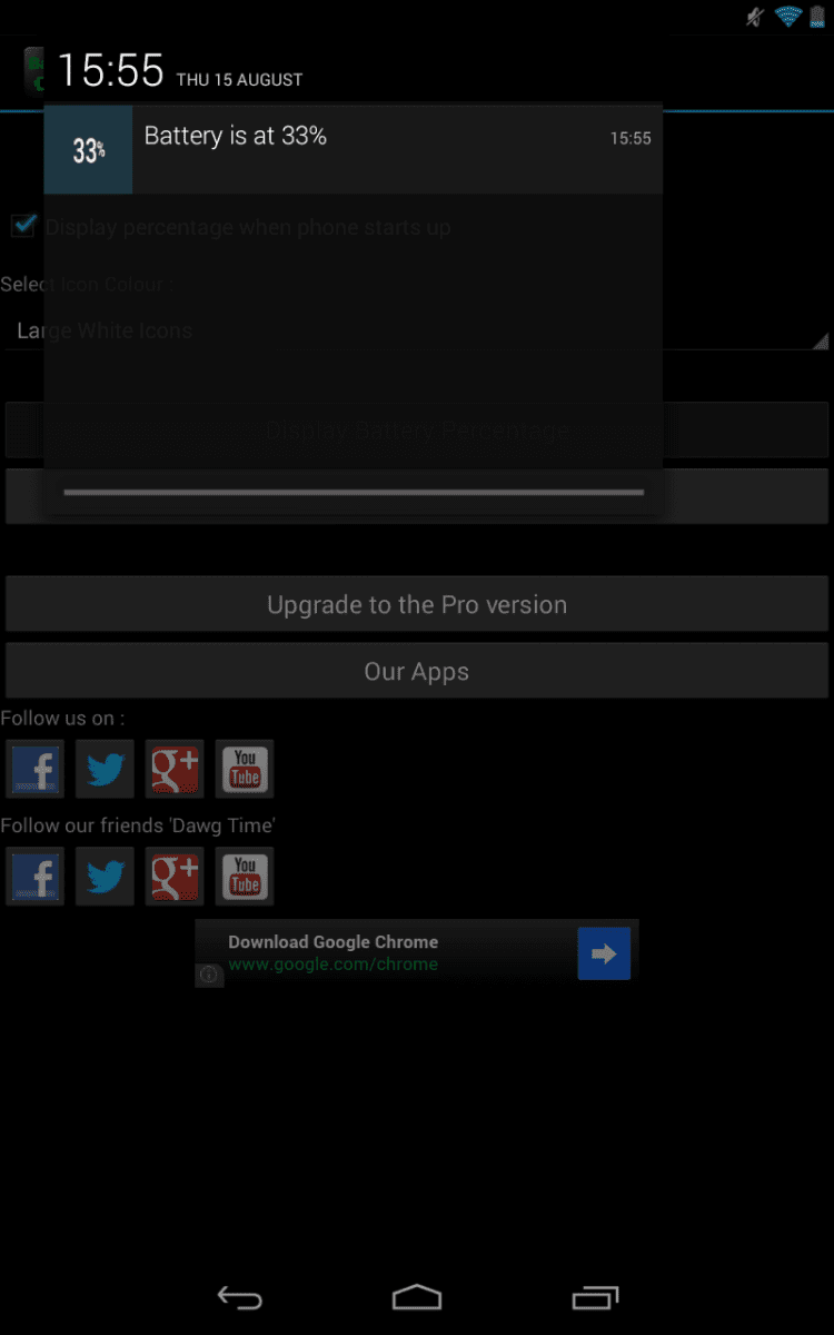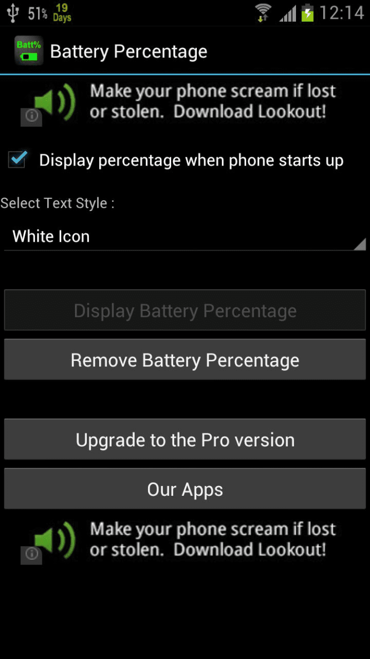 Battery Percentage Приложение, которое отображает текущий уровень заряда аккумулятора в строке состояния/панели уведомлений вашего мобильного устройства. Уведомление выглядит так, будто она является частью ОС Android. Обладает приятным интерфейсом и содержит несколько вариантов цветового оформления.