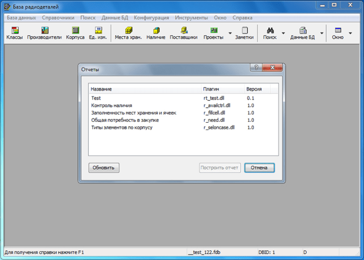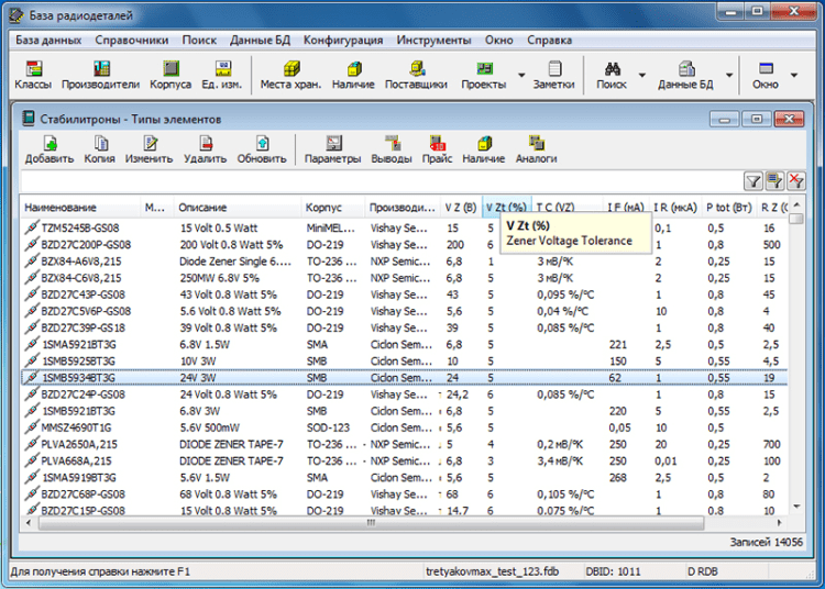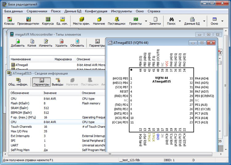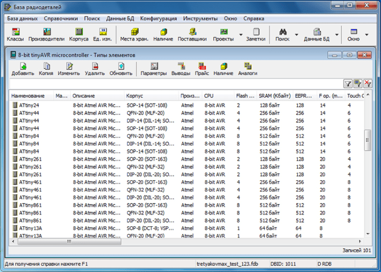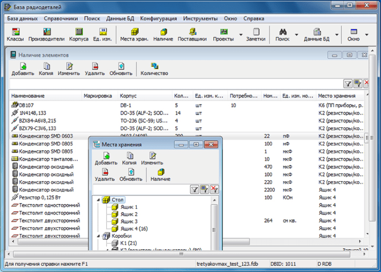 База радиодеталей - это программа "База радиодеталей" представляет собой бесплатный справочник по радиодеталям. Она предназначена в первую очередь для радиолюбителей. С ее помощью можно вести учет деталей (наличие, количество, поставщик, цена) и планировать проекты. Программа "База радиодеталей" может работать с USB-носителя или CD диска, что позволяет всегда держать ее под рукой.