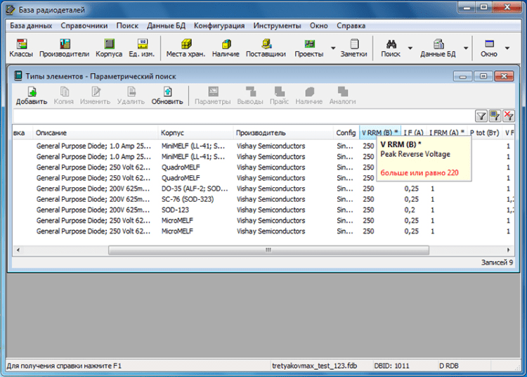 В программа можно найти подробную информацию по деталям. При необходимости эту информацию можно отредактировать или внести новые данные. В программе "База радиодеталей" есть функция поиска информации об элементах по их параметрам и различные инструменты для упрощенного ввода большого количества справочных данных. В ней также реализована функция обмена данными между пользователями.