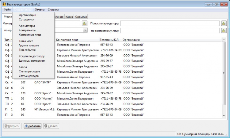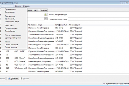 Она будет полезна не только для администрации и владельцев торговых и складских площадей (информация об арендаторе, арендуемом месте, классификации), но и для охраны арендуемых площадей (фиксации событий произошедших на объекте, причин предпринятых мер). В единой базе можно вести несколько организаций.