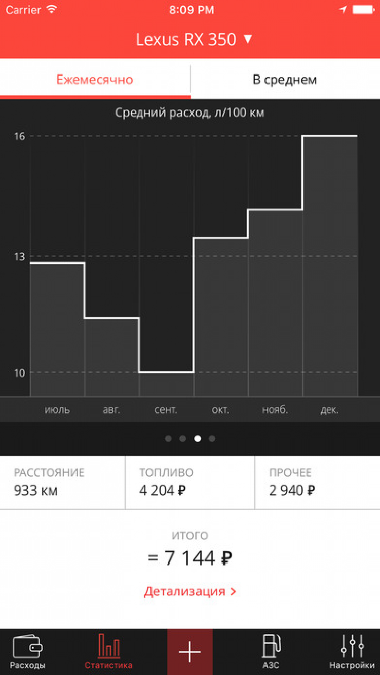 - отображение статистики затрат на автомобиль в графическом и детализированном виде;