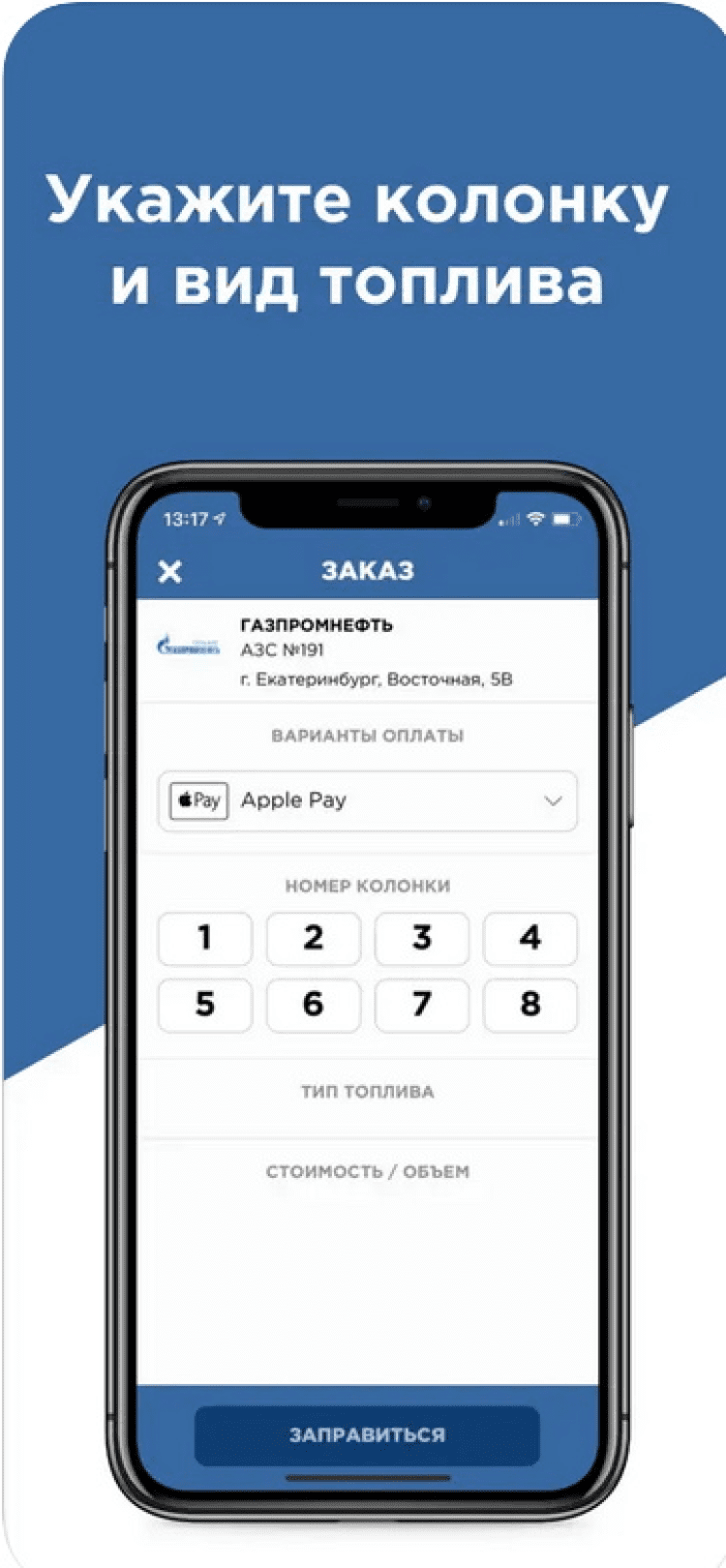 - выбор АЗС на карте, либо автоматическое определение при помощи гео-локации;